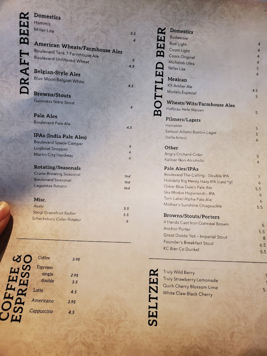 Beverages include a selection of beers alongside other drinks suitable for pairing with meals or enjoying during casual dining occasions.